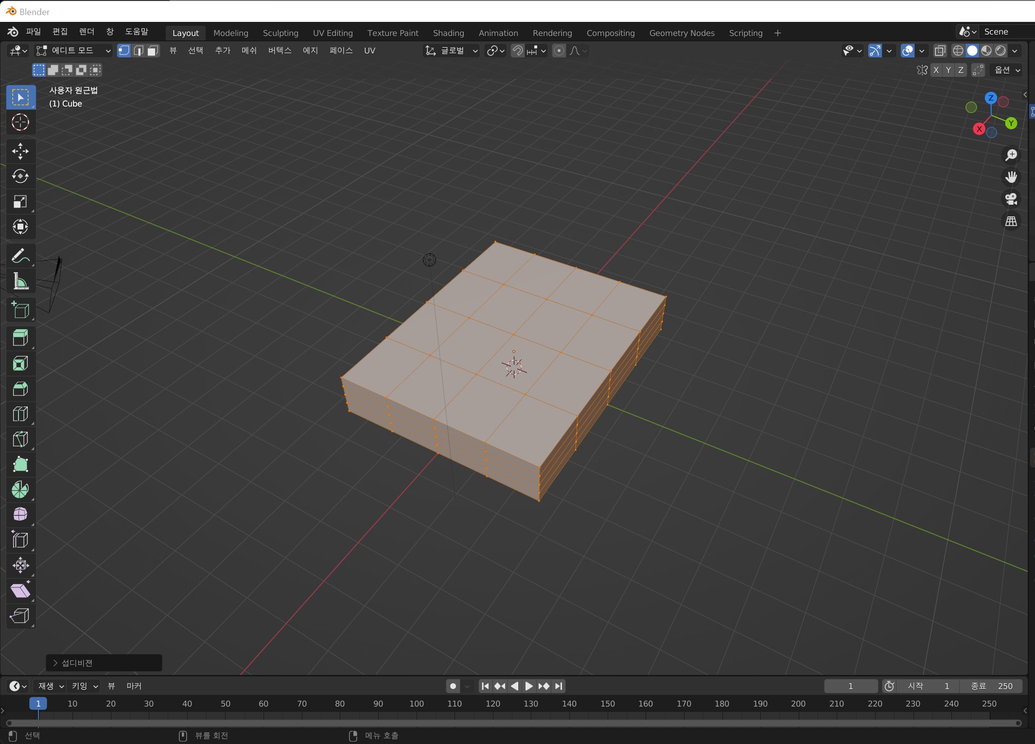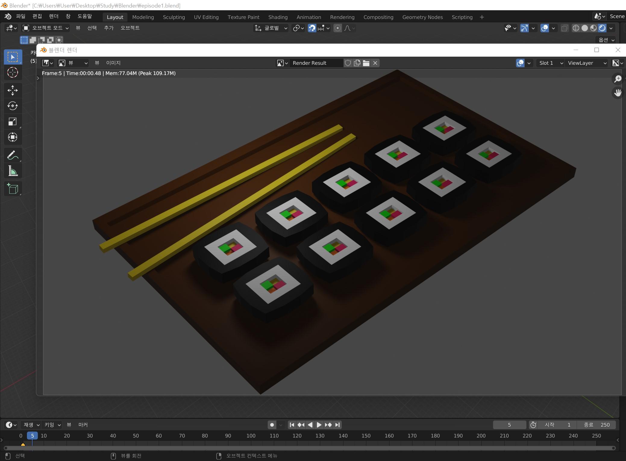 처음은 큐브만들기 - 큐브 크기 조절 (S) - 큐브 돌출 (E) - 테두리 옆면 돌출 - (색칠하기) - 젓가락 두개 회전 비스듬하게 - 카메라 세팅 - 렌더링 순으로 제작해 완성했다.